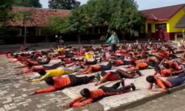 Dalam video yang beredar, nampak puluhan murid mengenakan seragam olahraga melakukan gerakan berenang di tengah lapangan sekolah.