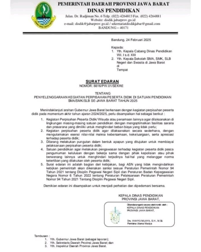 BANDUNG | RENGASDENGKLOKNEWS.COM | Menindaklanjuti arahan Gubernur Jawa Barat, Dinas Pendidikan Provinsi Jawa Barat menerbitkan Surat Edaran Nomor 6616/PW.01/SEKRE, terkait pelaksanaan kegiatan perpisahan peserta didik pada akhir tahun ajaran 2024/2025.
