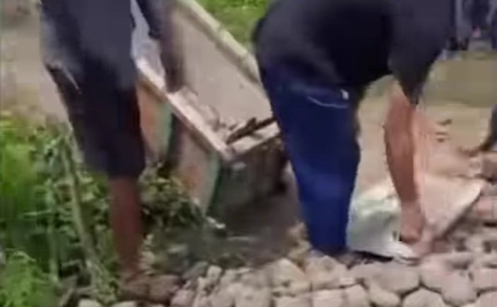 “Katanya dikirimin bantuan batu, tapi ya gitu, cuma dikasih bahan aja, gak ada tukangnya, gak ada ongkosnya. Kita warga disuruh ngerjain sendiri,” keluh salah satu warga yang turut membantu menguruk jalan.